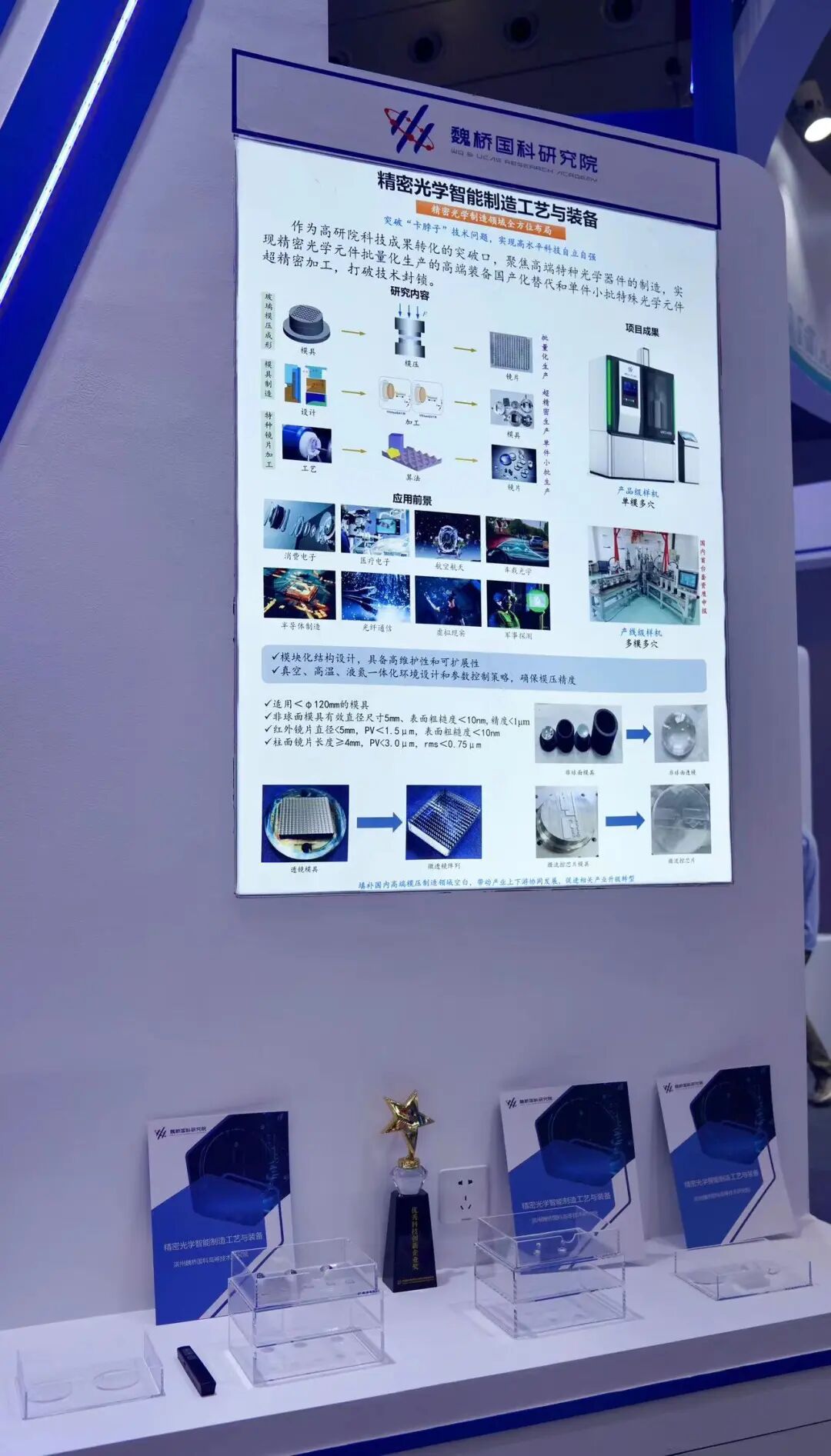 11月16日,第二十六届中国国际高新技术成果交易会(以下简称“高交会”)在深圳国际会展中心(宝安)圆满落幕。作为经国务院批准举办、历经二十余载风雨兼程的科技盛事,高交会已成为我国高新技术领域对外开放的重要窗口以及科技成果交流交易的桥梁,是科技强国的重要组成部分。作为山东省科教创产融合发展的新型研发机构——滨州魏桥国科高等技术研究院(以下简称“研究院”)以其卓越的创新能力脱颖而出,其自主研发的“精密光学器件智能制造工艺与装备”项目荣获“优秀科技创新企业奖”。“精密光学器件智能制造工艺与装备”项目,是研究院科研团队智慧与汗水的结晶。该项目成功突破了真空高温环境中精密运动系统密封技术、高温模架高精度保持技术、光学元件真空高温高压连续稳定控形控性技术等多项模压成形设备关键技术,研制出了精准温控模组、精密力控模组、高效转运模组等核心部件,并自主研发出国内首台旋转多工位模压成形设备样机。这一成果的诞生,不仅填补了国内高端光学模压装备制造领域自主创新的空白,更彰显了研究院在科技创新道路上的坚定步伐和卓越成就。本次高交会吸引了来自全球100余个国家和地区的5000余家知名企业与国际组织竞相参展,专业观众人数高达40万人次,共同见证了这场科技界的年度盛宴。