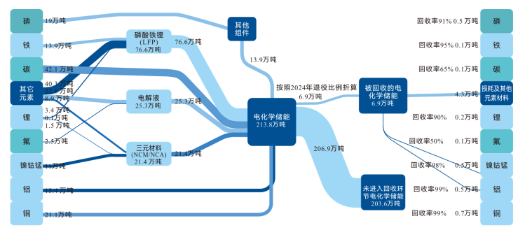物质流分析揭示,2024 年大湾区生产约 145.89 吨锂离子电池,需消耗磷酸铁锂和三元正极材料超 50 万吨,但全年仅 75% 的报废电池进入回收环节,资源循环利用仍有较大提升空间。在回收效率上,不同材料表现差异显著:集流体(铜箔、铝箔)回收率高达 99%,镍、钴、锰等关键金属回收率达 98%,而氟元素回收率仅为 50%,成为当前回收技术突破的核心难点。