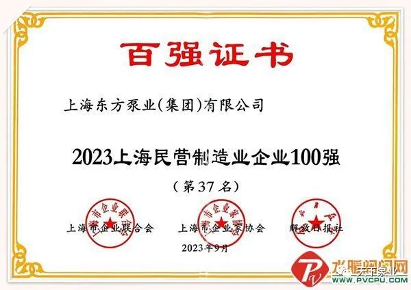 近日,2023上海百强企业发布会顺利召开并发布多项百强企业榜单。东方泵业荣登2023上海民营制造业企业100强(第37名),2023上海制造业企业100强(第57名),以及2023上海民营企业100强(第93名)。