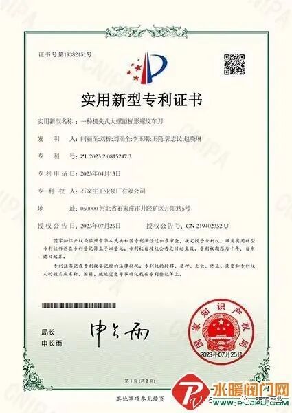 目前,石工泵公司自主研发的“一种机夹式大螺距梯形螺纹车刀” 和“一种渣浆泵零件用新型吊装工具”两项科技成果被中国国家知识产权局专利局授予实用新型专利。