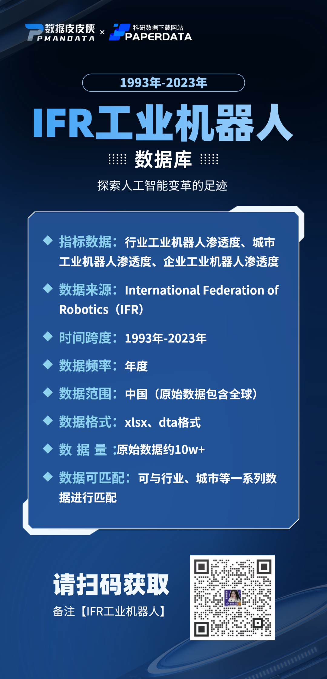 工业机器人数据作为未来经管研究的热点之一,皮皮侠团队收到无数这个数据的需求,为满足学者们的科研需求,数据皮皮侠团队携手PAPERDATA数据团队开发了IFR工业机器人数据库(2000-2023)。