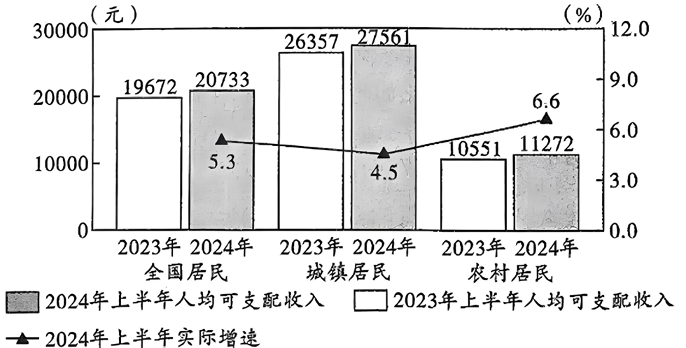 ③2024年上半年,人均可支配收入实际增长速度农村高于城镇