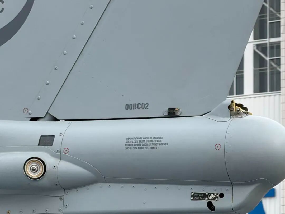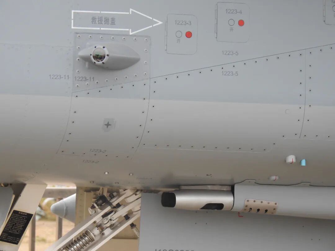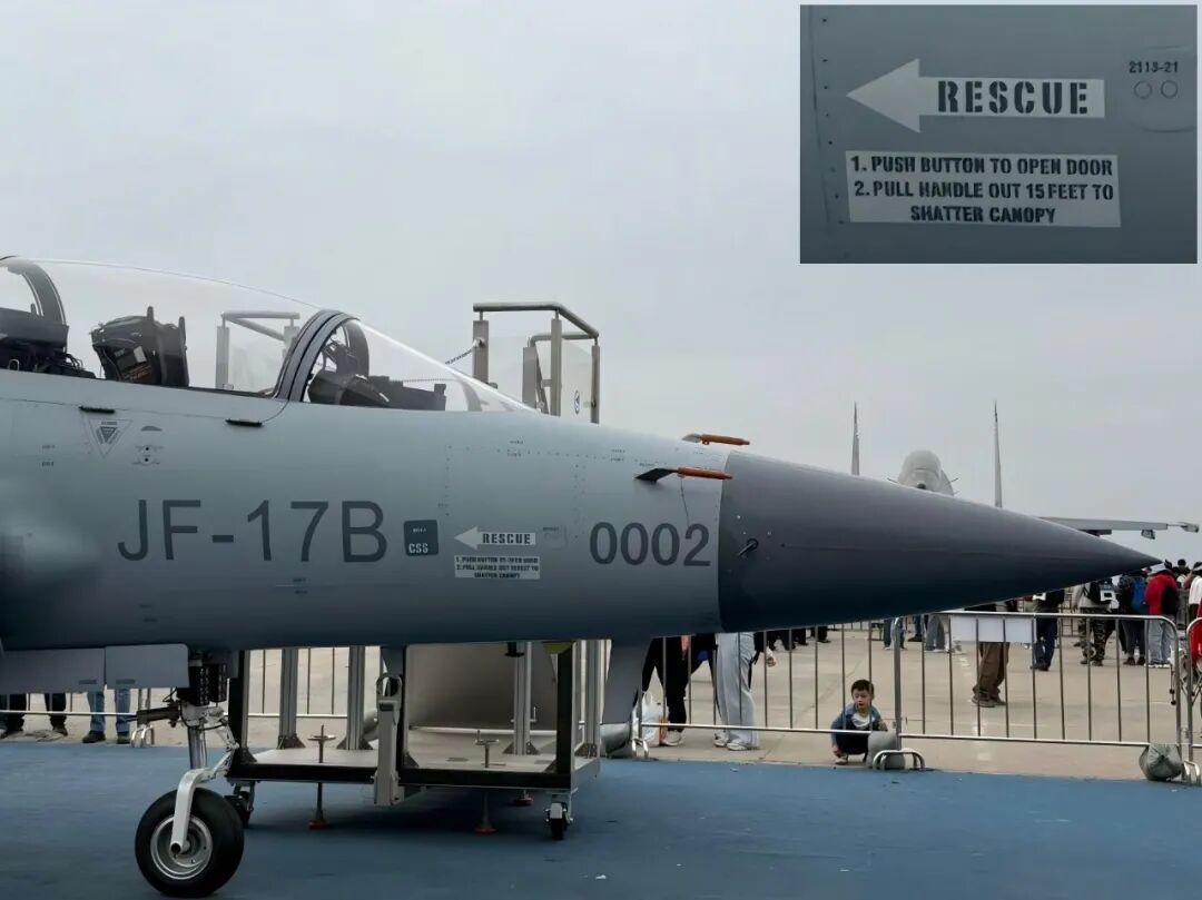 “枭龙”战斗机(1)| 该机翼展9.5米,比单座型略有增加,机长14.5米。参考单座型的最大载弹量,JF-17B型的最大载弹量可能为3-4吨。今年5月10日,据巴基斯坦国家广播电台消息,巴基斯坦空军的JF-17战斗机发射“高超音速导弹”摧毁了印度部署在阿达姆普尔的俄制S-400防空导弹系统“枭龙”战斗机(2)| “枭龙”战斗机采用侧翻式座舱盖,它的优势在于侧面打开空间大、便于飞行员出入“枭龙”战斗机(3)| “JF-17B”和“0002”字体之间的位置有个救援抛盖(RESCUE)提示:“按(CSS盖板处)的按钮打卡盖板,拉出手柄15英尺长度则座舱盖碎开;机头雷达罩后部红色箭头的针状物为空速管,用以测量飞机飞行和空气流动速度“枭龙”战斗机(4)| “枭龙”改为双座机型后,原结构的燃油空间被压缩,设计师在机背加装了大型油箱,因此总的燃油容量未见明显减少,且背部明显隆起。机背上显眼的刀状天线可能用于超短波战术通信;后座舱下方进气道外侧机翼上方的圆形装置为空中加油照明灯