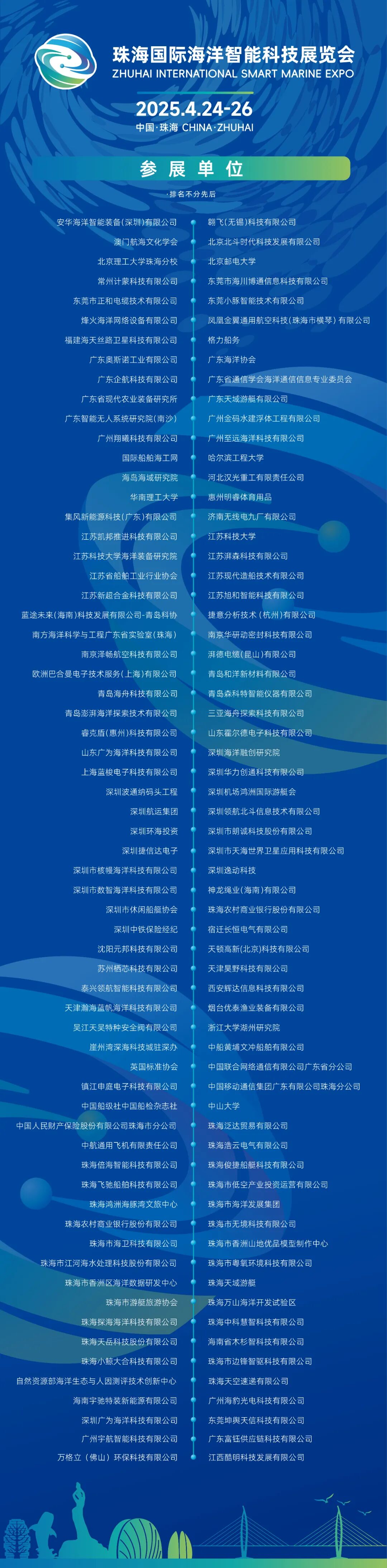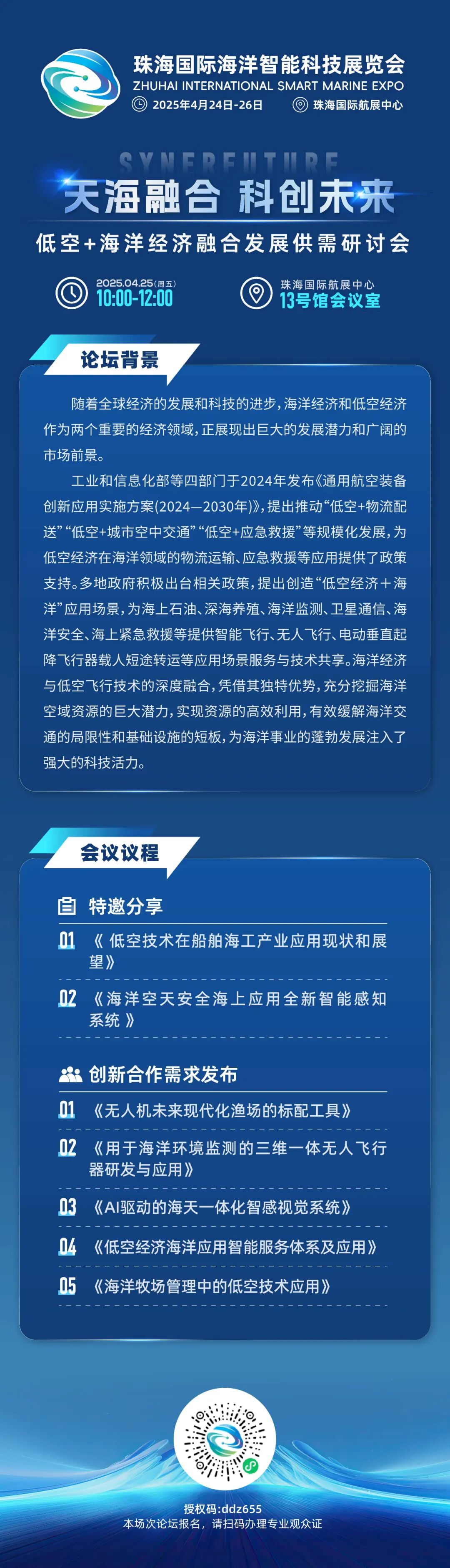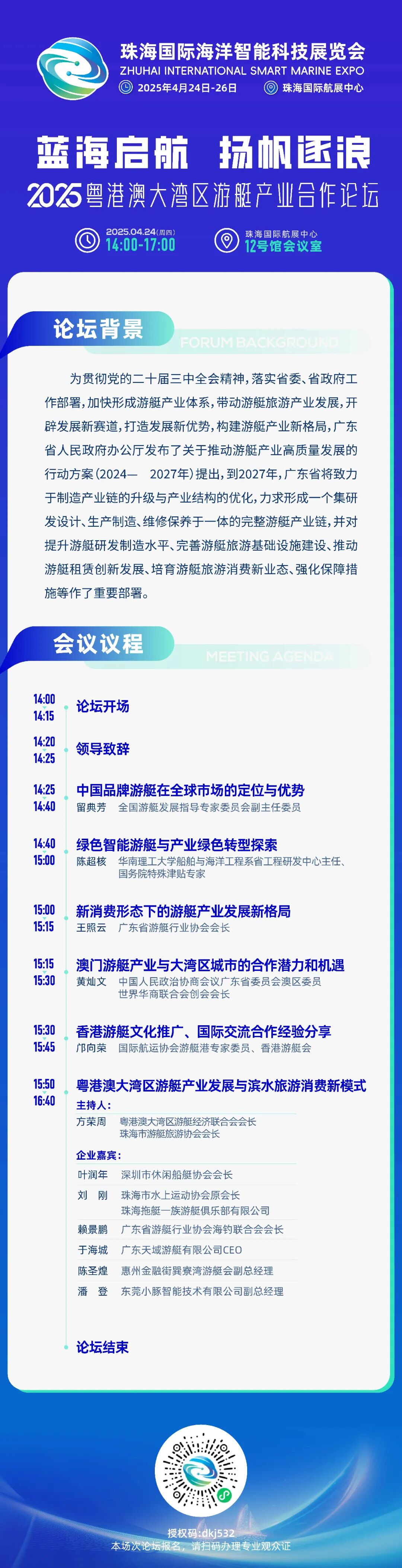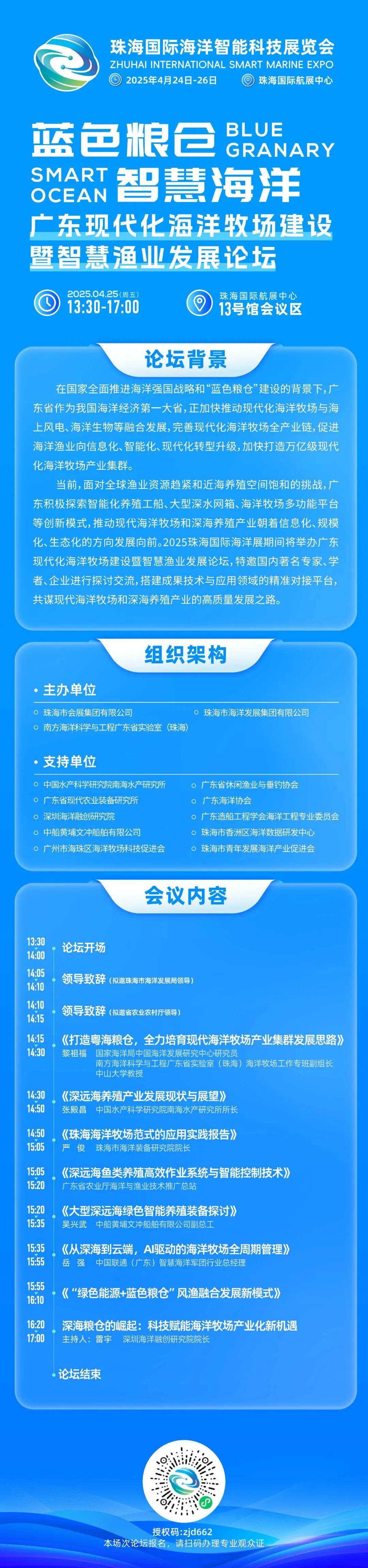 2025珠海国际海洋智能科技展览会(简称“2025珠海海洋展”)将于2025年4月24-26日在珠海国际航展中心举办。本届展会预计将汇聚超过200家海洋智能及无人装备、海洋新能源、智慧船舶、海洋防腐及新材料、海洋牧场及深海养殖装备、游艇、海岛开发及旅游等海洋领域企业参展,规划展会面积3万平方米。