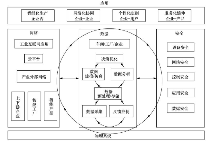 工业互联网体系架构 1.0 涵盖了数据层面、网络层面和安全层面。数据层面主要用于生产数据的感知和产品反馈优化,通过 IoT 技术将生产数据进行采集,通过数据建模与仿真,将数据进行分析得到优化决策,从而反馈到生产层面实现产品生产的优化;网络层面为适应智能制造发展,促使工厂内部网络呈现扁平化、IP 化、无线化及灵活组网的特点。