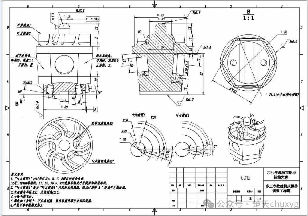 本赛题选自2024职业技能大赛多工序数控机床操作调整工赛题,编程软件为Mc2024 or UG12.0。职工及院校教师组实操题。