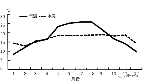 平流雾是暖湿空气平流到较冷的下垫面形成的雾。湖南省郴州市东江湖的著名景观“雾漫小东江”与平流雾密切相关。图示意2020年小东江库区气温和水温的逐月分布。据此完成下面小题。