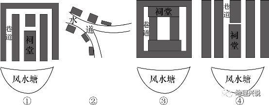 2.风水塘离部分民居较远,且水塘一般地势较低,水体流动性较差,水质较差,不宜作为主要饮用水源,A错误;平行巷道有利于夏季通风和排水,B错误;由图可知,祠堂一般位于村落核心位置,C正确;水运速度较慢,且现代水运更适合货运,疍民现在出行的主要方式应为公路运输,D错误。故选C。