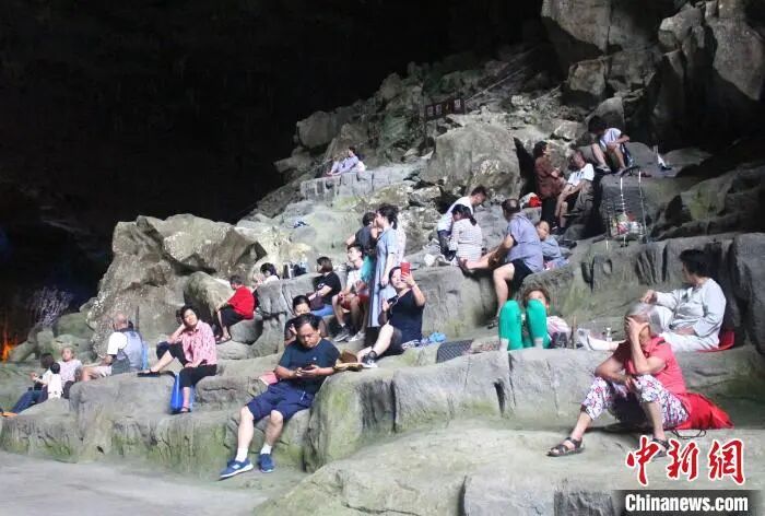 在河池巴马百魔洞景区,“候鸟人”和游客在“磁疗区”疗养。张晓曦 摄