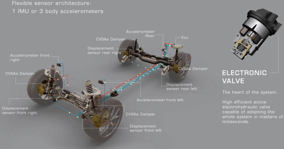 在文章《底盘电动化趋势下,液压技术在悬架领域如何老当益壮? | 液压互联智能悬架搭载车型及技术解析》中曾对天纳克公司的CVSAe单外置阀持续可调电控减振器,CVSA2外置双阀持续可调电控减振器和Kinetic® 液压互联悬架专用减振器进行过介绍,如下图所示为CVSAe的整车应用及电磁阀技术介绍。