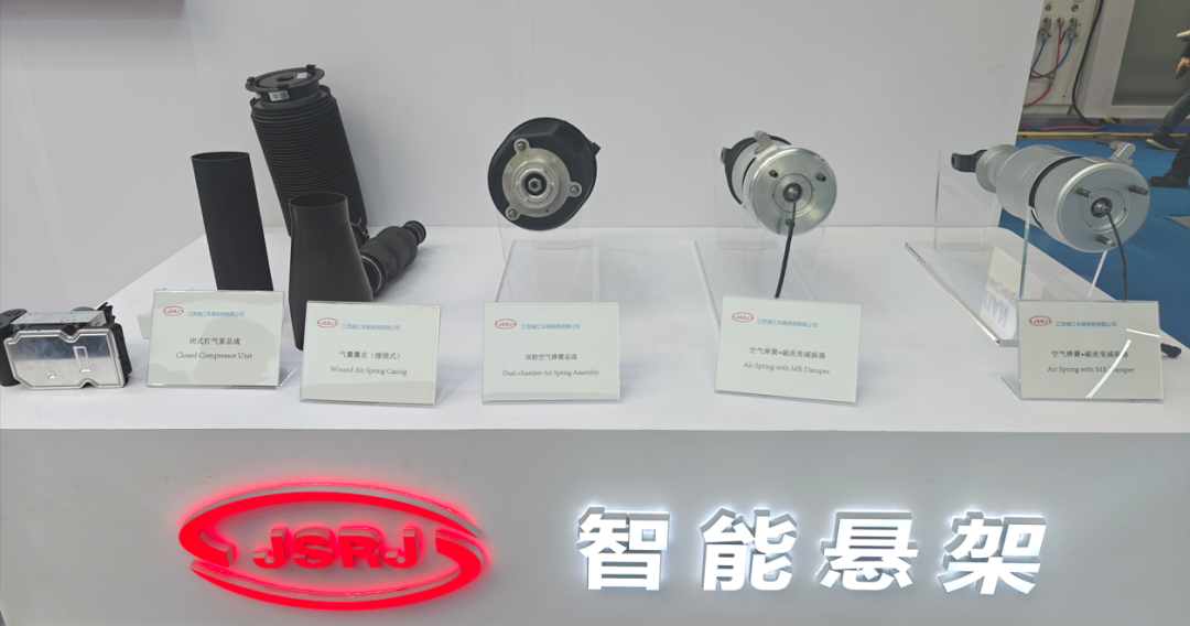 本次展会上江苏瑞江展出了闭式打气泵总成,气囊囊皮,双腔空气弹簧总成,磁流变减振器等产品。
