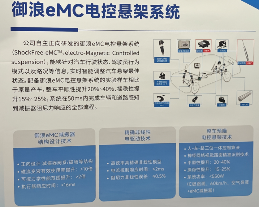 御浪 eMC 电控悬架系统(ShockFree-eMC, electro-Magnetic Controlled Suspension),集成了整车路面预瞄,精确非线性电驱动技术和减振器阀系设计,从产品应用逻辑上属于半主动悬架(空气弹簧+半主动减振器)。