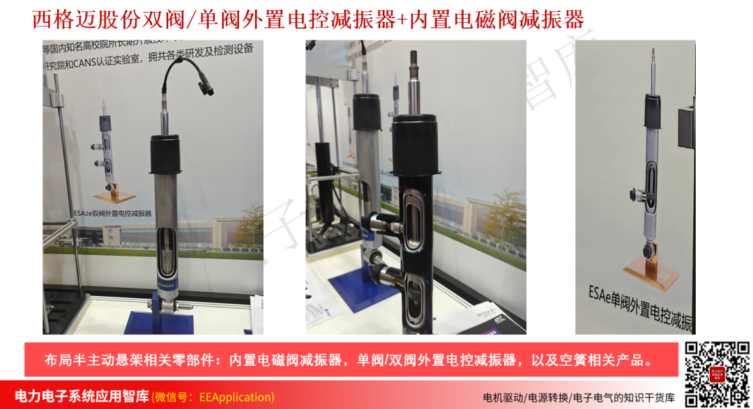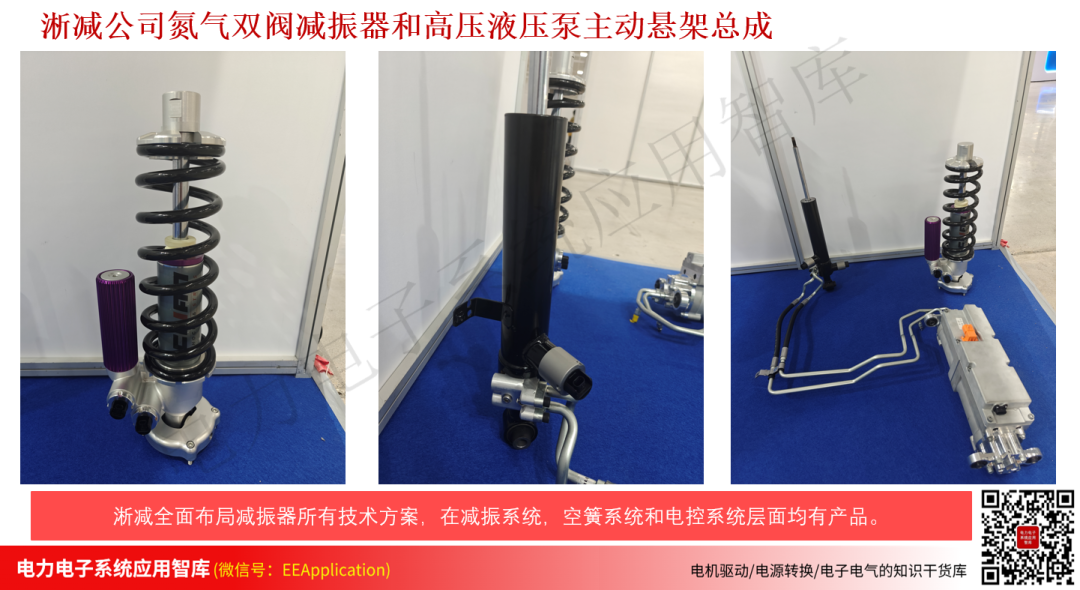 作为减振器方向的老牌龙头企业,淅减在减振,空簧和电控系统方面全面布局,本次展会上主要展出了两款产品:氮气双阀连续可调减振器和高压液压泵全主动悬架总成,如下图所示。