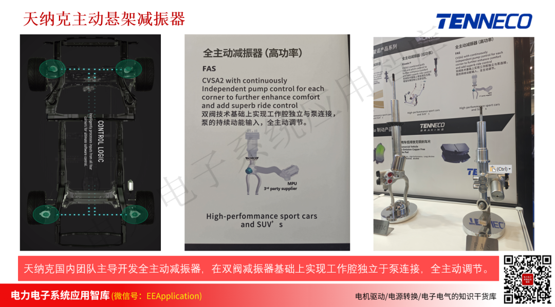 产品动态及最新进展:天纳克之前的产品一直聚焦在被动悬架和半主动悬架减振器产品上,本次展览天纳克展出了以国内团队为主导的主动悬架减振器,配合高压液压泵实现主动控制;拓展了其产品发展路线,促进其融入国内各大主机厂新产品的迭代进程。