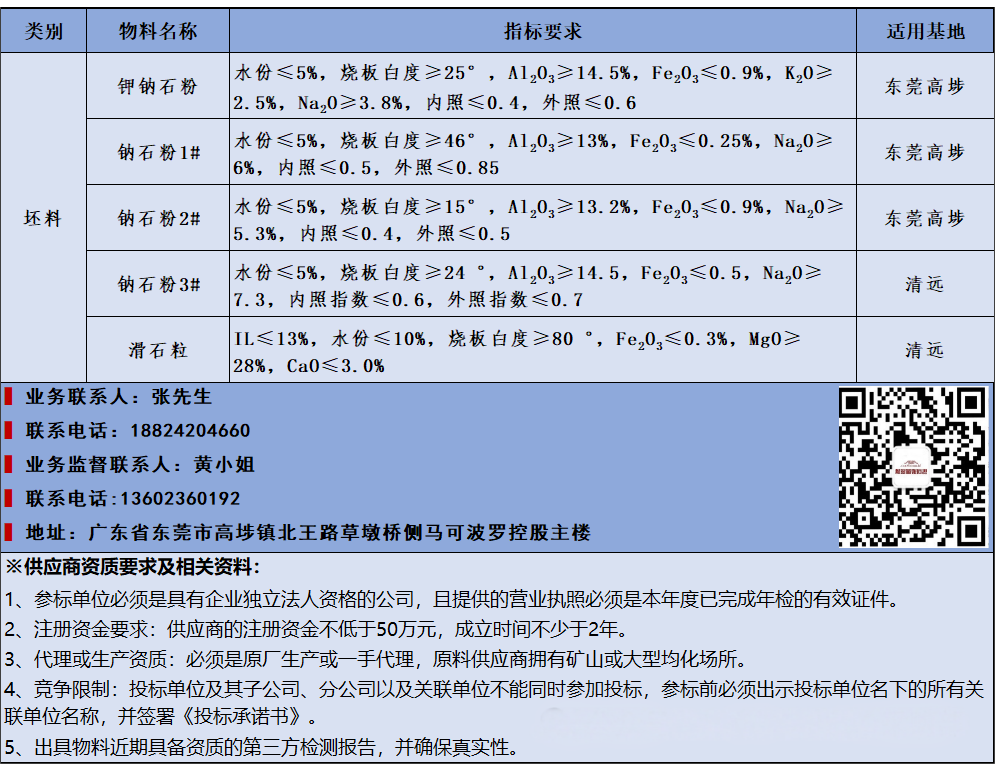 1、马可波罗控股坯料供应商招标