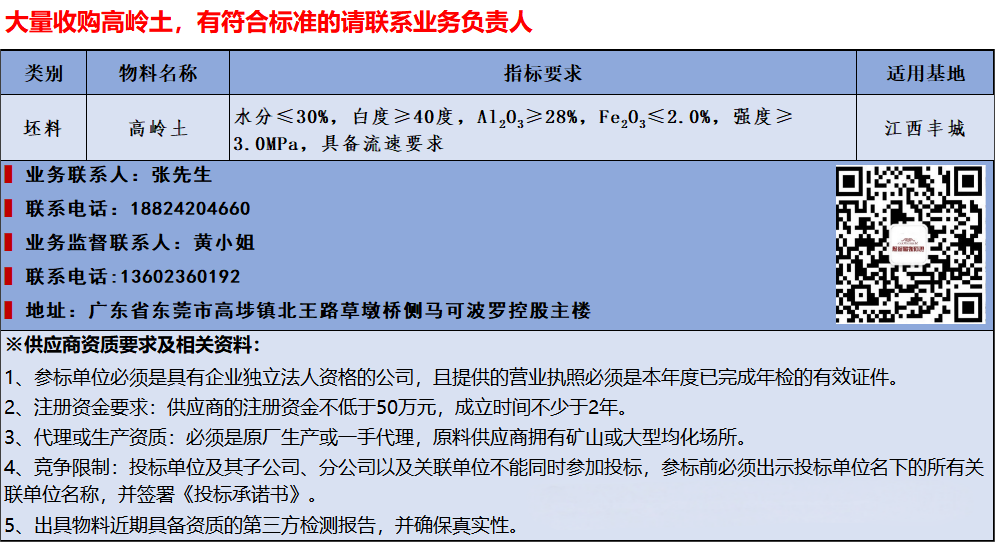 本专栏定期每周发布陶瓷行业各类供求信息,为陶瓷厂家和上下游供需企业牵线搭桥,提供一个专业的、有效的沟通平台。