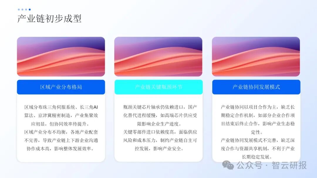 • 产业链分布‌:上游核心零部件(芯片、传感器)仍依赖进口,中游软件集成(AI算法、云服务)和下游应用场景(工业、医疗、教育)初步形成集聚效应,但协同效率待提升
