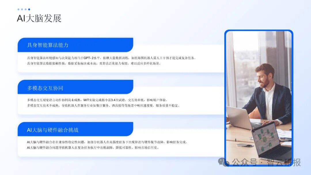 • 硬件技术‌:具身机器人已在运动控制(如动态平衡、复杂地形适应)和感知能力(3D视觉、触觉反馈)方面取得突破,但能源效率低(续航不足)、核心零部件成本高昂(如进口芯片、轴承)等问题仍制约规模化应用