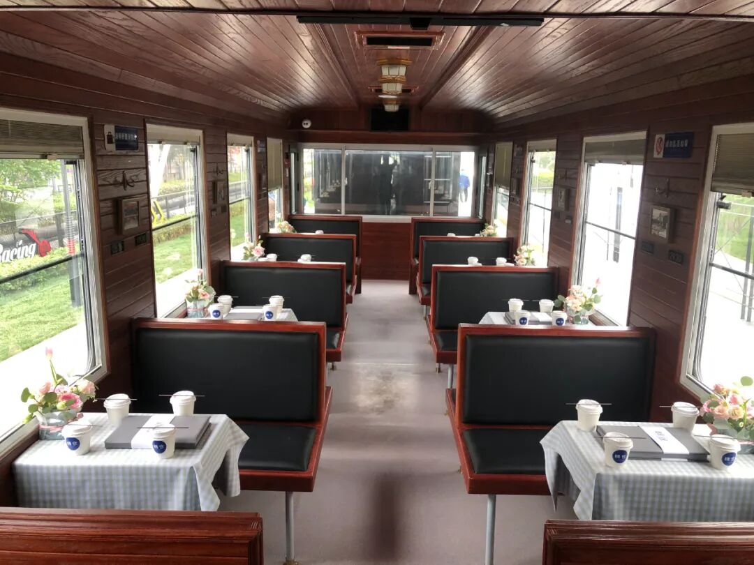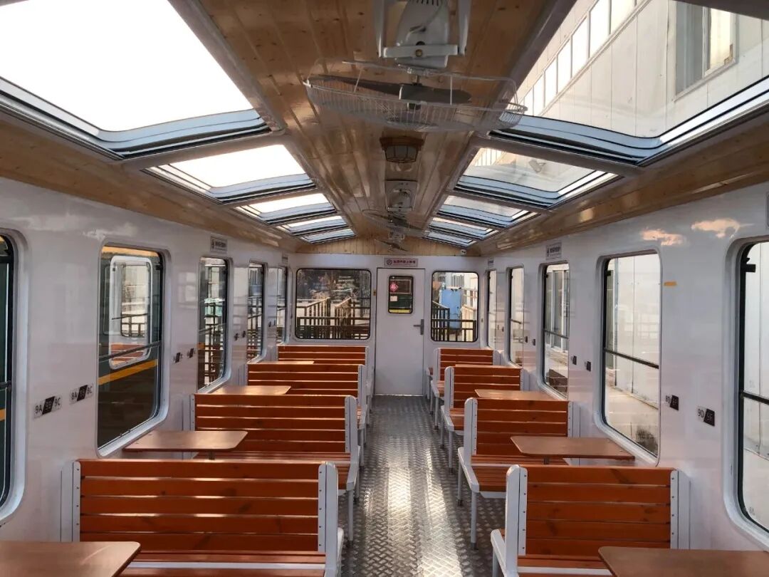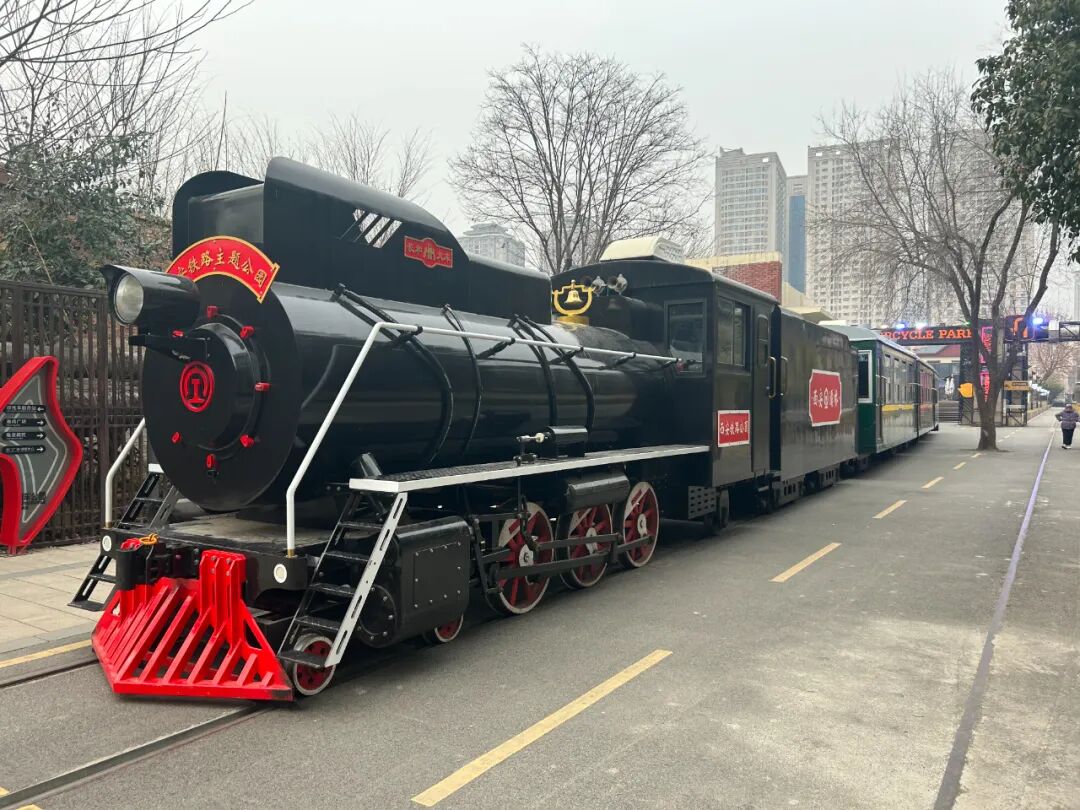 火车概况:陕西首列“人民型”机车复刻品,老式蒸汽机车采用黑红配色与复古造型,还原20世纪铁路工业风貌,成为标志性拍照打卡点,橄榄绿车厢印有“软座车”字样,内部布置仿古座椅、木质装饰及纺织工业历史展品,营造时光倒流的沉浸感。