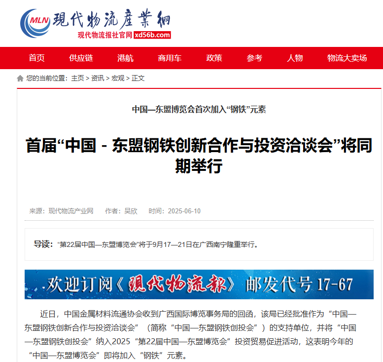 近日,中国金属材料流通协会收到广西国际博览事务局的回函,该局已经批准作为“中国-东盟钢铁创新合作与投资洽谈会”(简称“中国-东盟钢铁创投会”)的支持单位,并将“中国-东盟钢铁创投会”纳入2025“第22届中国-东盟博览会”投资贸易促进活动,这表明今年的“中国-东盟博览会”即将加入“钢铁”元素。