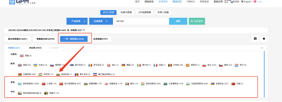 利用GPM数据系统筛选“一带一路”沿线的采购商数据,推送符合当地需求的绿色能源或智能家居产品,避开美国市场波动。