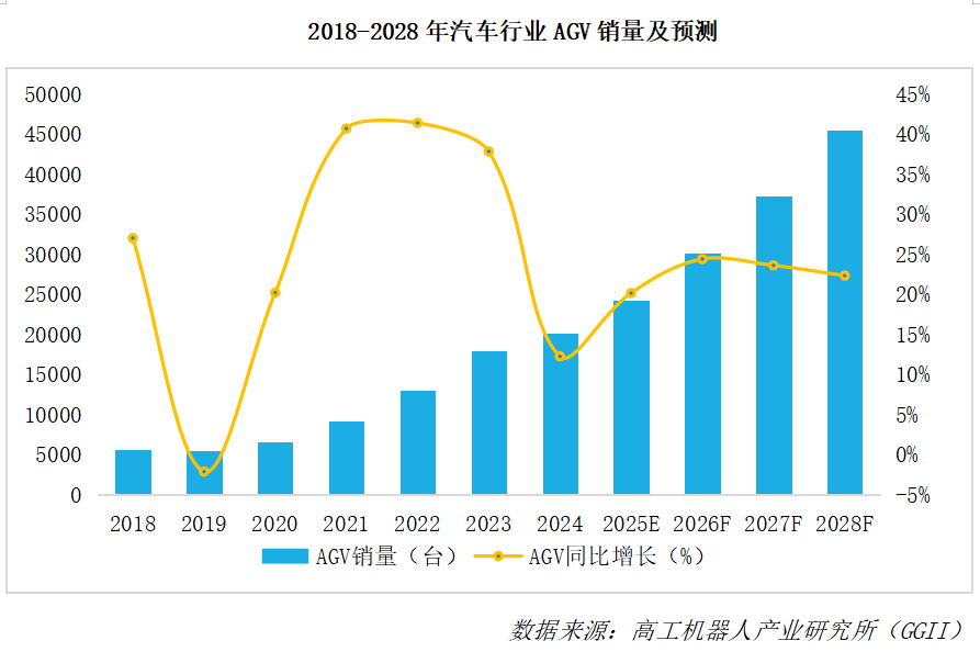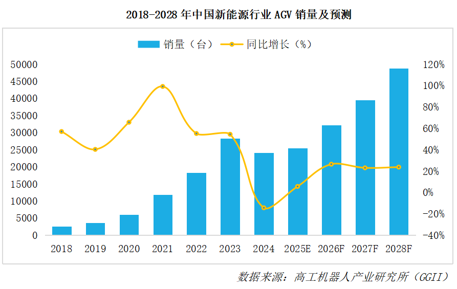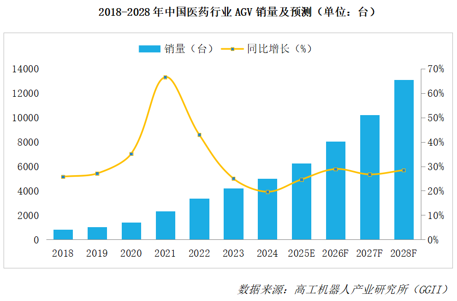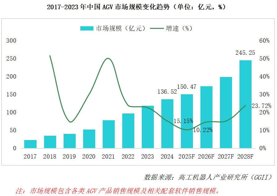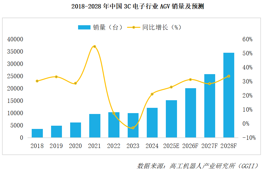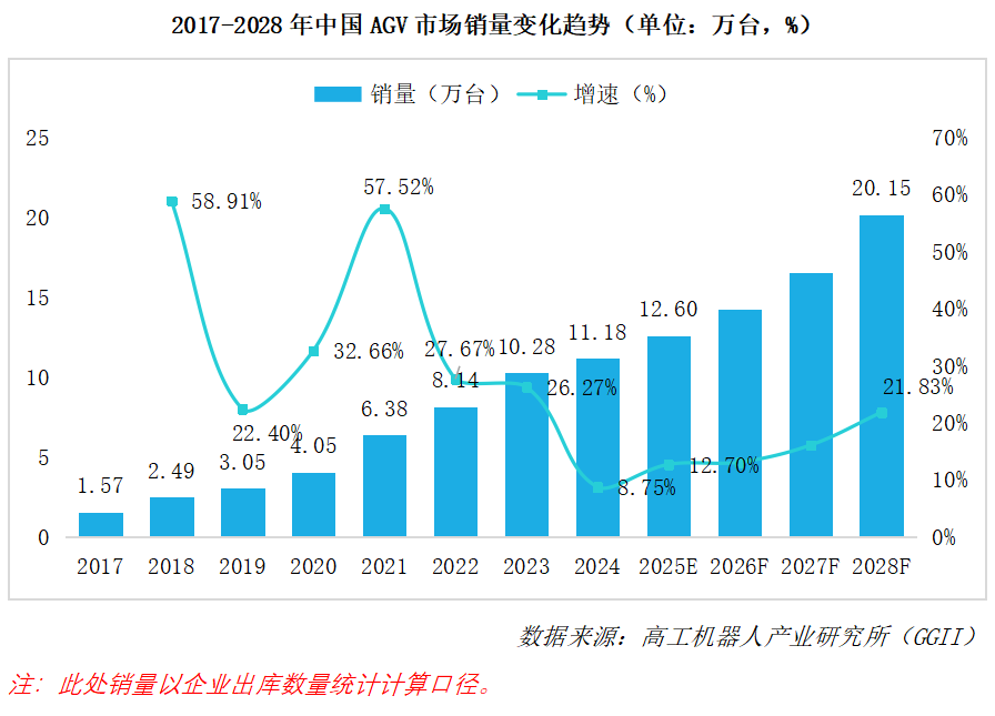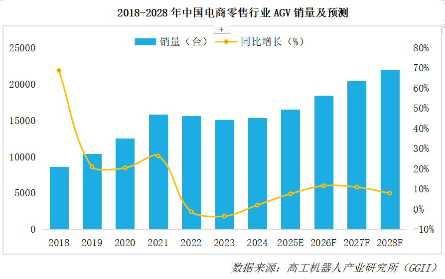 加入高工移动机器人行业群,加微信:13692257554,出示名片,仅限移动机器人及智能制造产业链相关企业。GGII数据显示,2024年中国移动机器人市场销量11.18万台,同比增长8.75%;市场规模136.52亿元,同比增长15.15%。预计2025年中国移动机器人市场销量将达到12.60万台,到2028年销量有望突破20万台,市场规模达到245亿元。现阶段,中国移动机器人市场仍属于竞争型市场,行业集中度正逐年提升,2024年中国移动机器人行业集中度CR5超过50%,马太效应进一步显现,各厂商之间差距正在逐渐扩大。从融资角度看,据GGII不完全统计,2024年中国移动机器人市场共发生16笔融资,涉及金额15.2亿元。相较于2023年均呈现断崖式的下滑态势,某种程度上可以认为,移动机器人行业在资本市场的被关注度已经到了历史低点。GGII数据显示,在中国市场,AGV主要应用在电商/零售/物流、汽车及零部件、3C电子、锂电、光伏等行业,合计占比超70%。2024年下游应用行业需求分化明显,大部分行业需求承压,3C电子行业需求复苏,汽车需求企稳,新能源行业承压明显,其他细分行业增量需求相对疲软。 1)汽车行业据GGII统计,从目前国内汽车制造厂商的数据来看,大多数汽车企业都采用了国产的移动机器人作为厂内生产物流的流通硬件,国产化率较高。GGII统计数据显示,2024年,汽车制造业中AGV销量2.01万台,同比增长12.22%,GGII预计到2026年AGV在汽车行业的销量有望突破3万台,到2028年销量有望突破4.5万台。2)新能源行业根据GGII数据显示,2024年新能源行业(锂电及光伏)AGV销量2.41万台,同比下滑14.47%。近两年来,新能源行业面临周期性调整的影响,加上产能过剩的潜在风险,新增投资有所放缓,预计到2026年新能源行业AGV销量有望超3.2万台,到2028年销量有望突破4.8万台。3)3C电子行业GGII统计数据显示,2024年,3C及半导体行业中AGV销量12156台,同比增长20.92%。GGII预计未来几年3C及半导体行业AGV需求将延续增长态势,到2026年,AGV销量有望突破2万台,到2028年销量有望突破3.4万台。4)电商零售GGII统计数据显示,2024年,快递/电商/零售行业应用AGV规模约为15345台,同比增长1.95%。目前,电商及物流企业逐渐将企业竞争力转移到提高用户体验,提升运送效率上来。随着智能仓储需求快速增长,亦会拉动AGV在电商行业的应用,GGII认为,因为部分电商及物流厂商已开始培养内部团队进行智能物流仓储的升级,某种程度上对外部AGV的需求会有所放缓,预计未来几年电商行业AGV需求增速在5%-10%左右,预计到2028年,快递/电商/零售行业AGV销量有望达到2.2万台。5)医药医疗根据GGII数据显示,2024年医药行业移动机器人销量5012台,同比增长19.59%。因医药制造环节和流通环节的分离式作业模式向协调作业的模式发展,为满足个性化和定制化需求,未来智能化的制药工厂中,智能、精准、高效的智能物流仓储需求会更加强烈,预计2026年,医药行业移动机器人销量将超过8000台,到2028年有望突破1.3万台。在充分调查的基础上,高工机器人产业研究所(GGII)编制了《2025年中国移动机器人(AGV)行业调研报告》。本报告对2024年及未来几年中国移动机器人(AGV)行业的市场发展特点、AGV市场产量规模、AGV市场竞争情况、各应用领域产品需求、市场发展趋势、行业发展环境等进行了详细的研究和分析。GGII希望通过切切实实地调查,深入研究分析,为企业、投资者、证券公司以及想了解机器人产业的人士,提供具有参考价值的机器人行业数据及调查报告。数据范围及说明:本报告数据范围2018--2028年;本报告数据以中国大陆地区数据为主,全球其他地区数据少量涉及。版权说明:本报告版权归高工机器人产业研究所(GGII)所有,仅供被授权企业公司内部使用,不得扩散给任何第三方使用。注:本报告中移动机器人包含了AGV及AMR,在国内广义上的认知都叫AGV机器人。AGV--Automated Guided Vehicle,也叫AGV小车;AMR--Autonomous Mobile Robot,即自主移动机器人,AMR与AGV类似,但它无需借助磁条、导轨、二维码等外部基础设施。目录第一部分 概念篇第一章 移动机器人的分类第一节 移动机器人的定义第二节 移动机器人的分类第二章 移动机器人产业链分析第一节 核心零部件第二节 AGV 本体第三节 系统集成商第二部分 背景篇第三章 移动机器人行业发展环境分析第一节 行业政策发展环境分析第二节 经济发展环境分析一、各行业固定资产投资情况分析二、投融资市场分析第三部分 产品篇第四章 移动机器人产品销售模式分析第一节 移动机器人产品价格分析一、产品价格二、价格趋势分析第二节 企业产品价格分布第三节 付款条件分析第五章 移动机器人产品投资回报分析第一节 移动机器人寿命分析第二节 移动机器人成本结构分析一、移动机器人系统成本二、实施及售后服务成本第四部分 市场篇第六章 移动机器人市场销量及规模情况第一节 全球移动机器人发展现状一、全球移动机器人市场规模二、全球移动机器人市场竞争三、全球移动机器人发展模式第二节 全球移动机器人应用市场分析一、全球移动机器人应用行业分布二、全球移动机器人应用市场发展趋势第三节 移动机器人中外发展比较一、移动机器人中外技术差距二、移动机器人中外价格差距第四节 中国移动机器人市场销量及规模第五节 主要移动机器人销量及规模一、类KIVA AGV二、工业AMR三、无人叉车四、磁导AGV五、料箱机器人六、复合机器人第