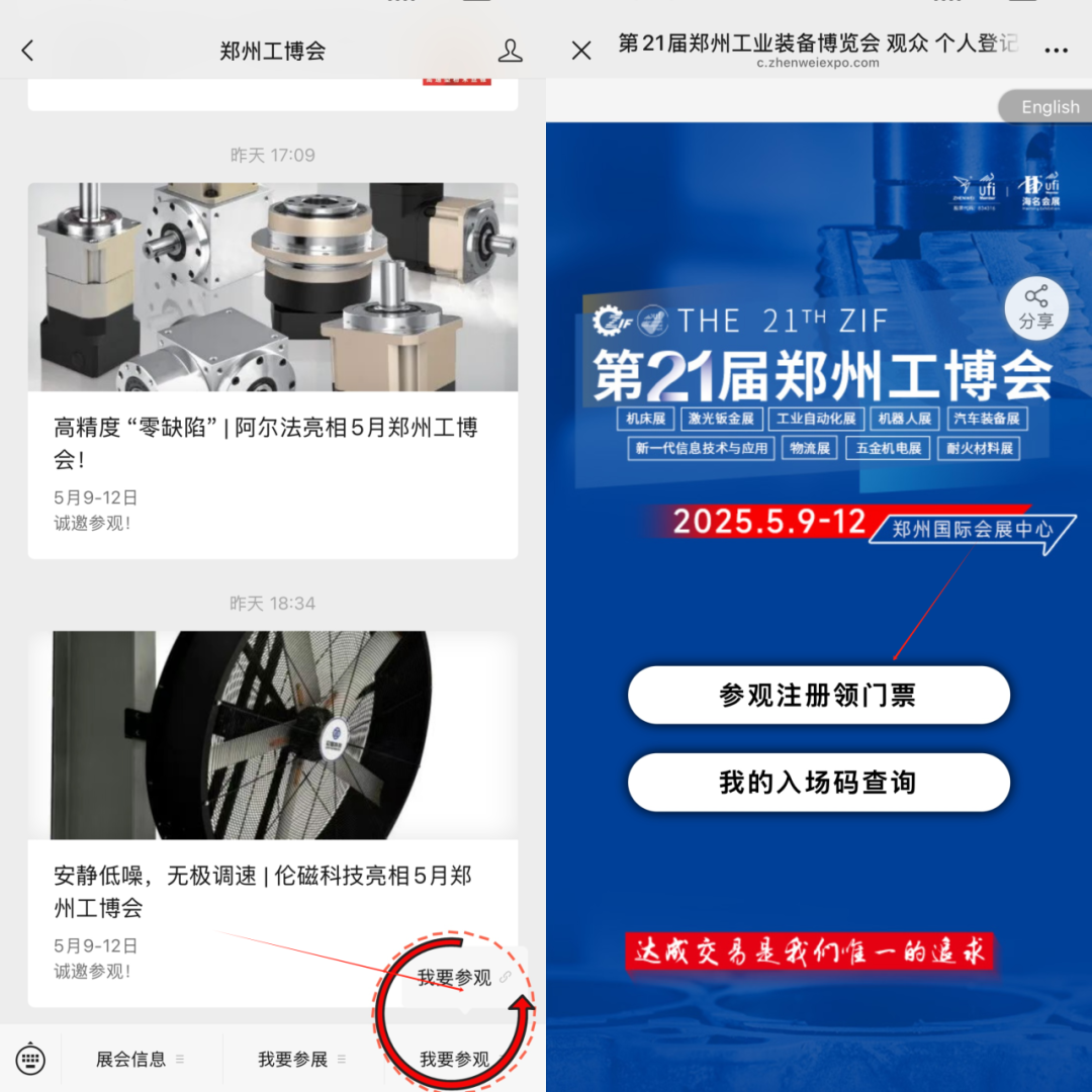 关注微信公众号“郑州工博会”,点击“我要参观”根据提示填写相关信息,点击提交即可;
