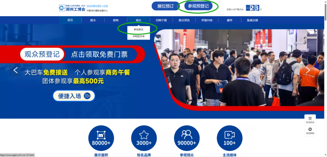 浏览器打开官网:www.zzgbh.cn,选择观众栏目点击“参观报名”或点击网站顶部“参观预登记”按钮,根据提示填写相关信息,点击提交即可。