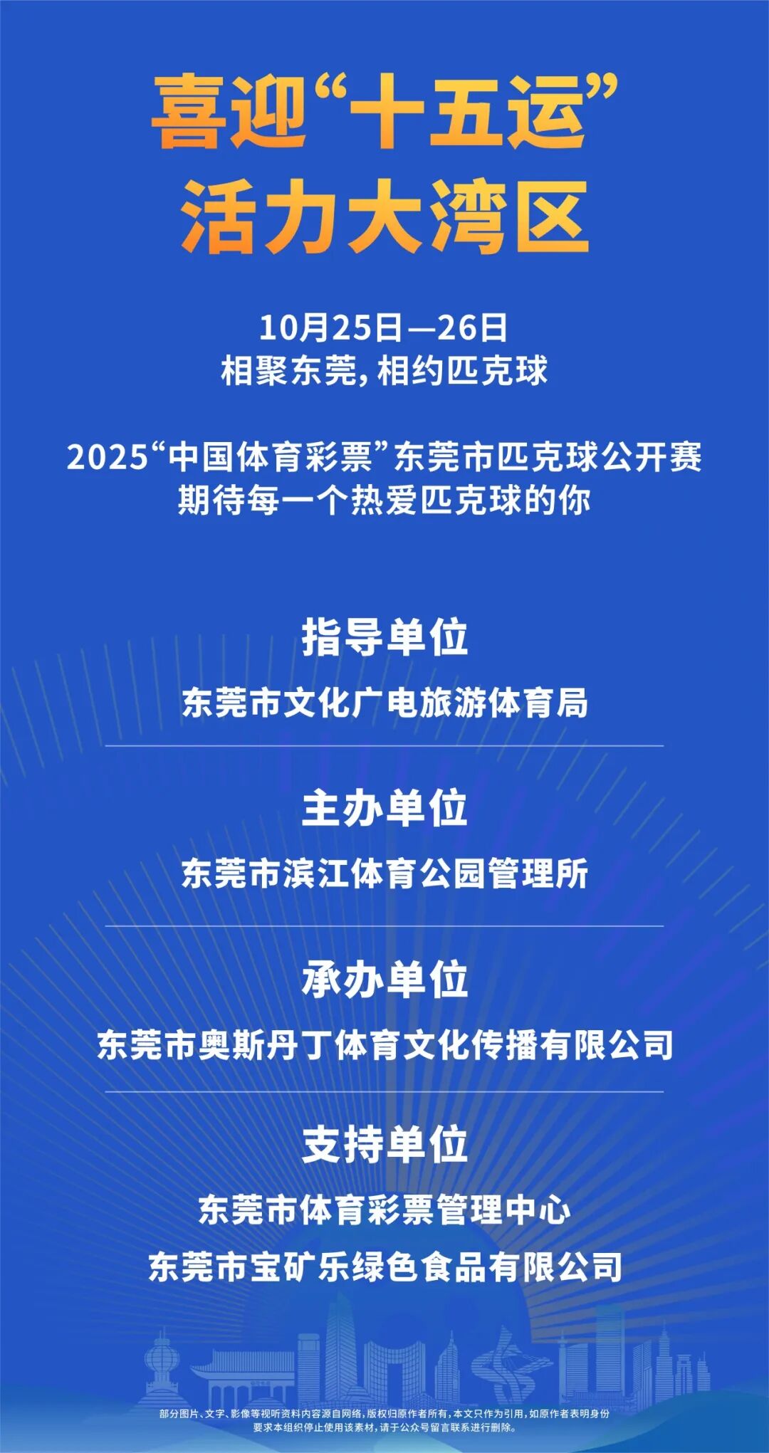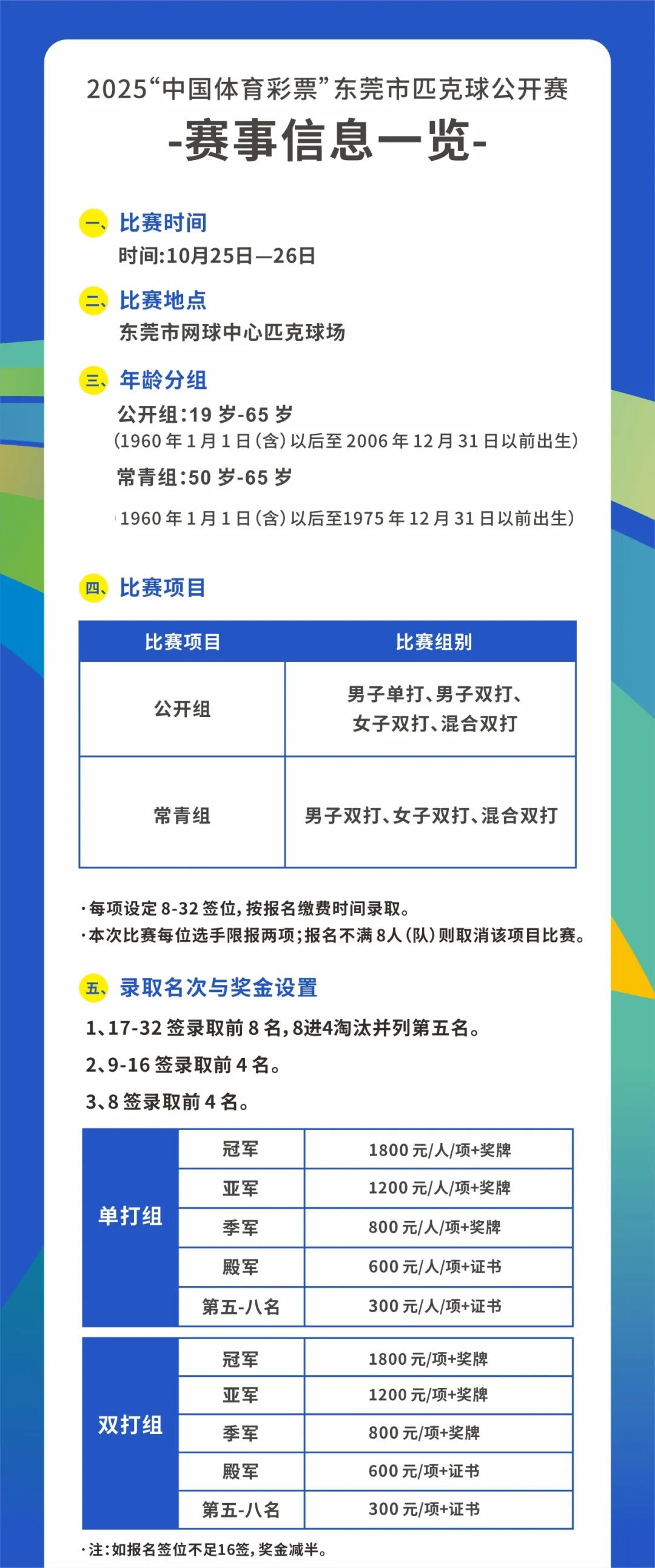3、抽签:在 2025 年 10 月 21 日 18:00 前进行抽签,并且在指定网站、微信公众平台或者参赛运动员微信群公布签表和比赛日程。